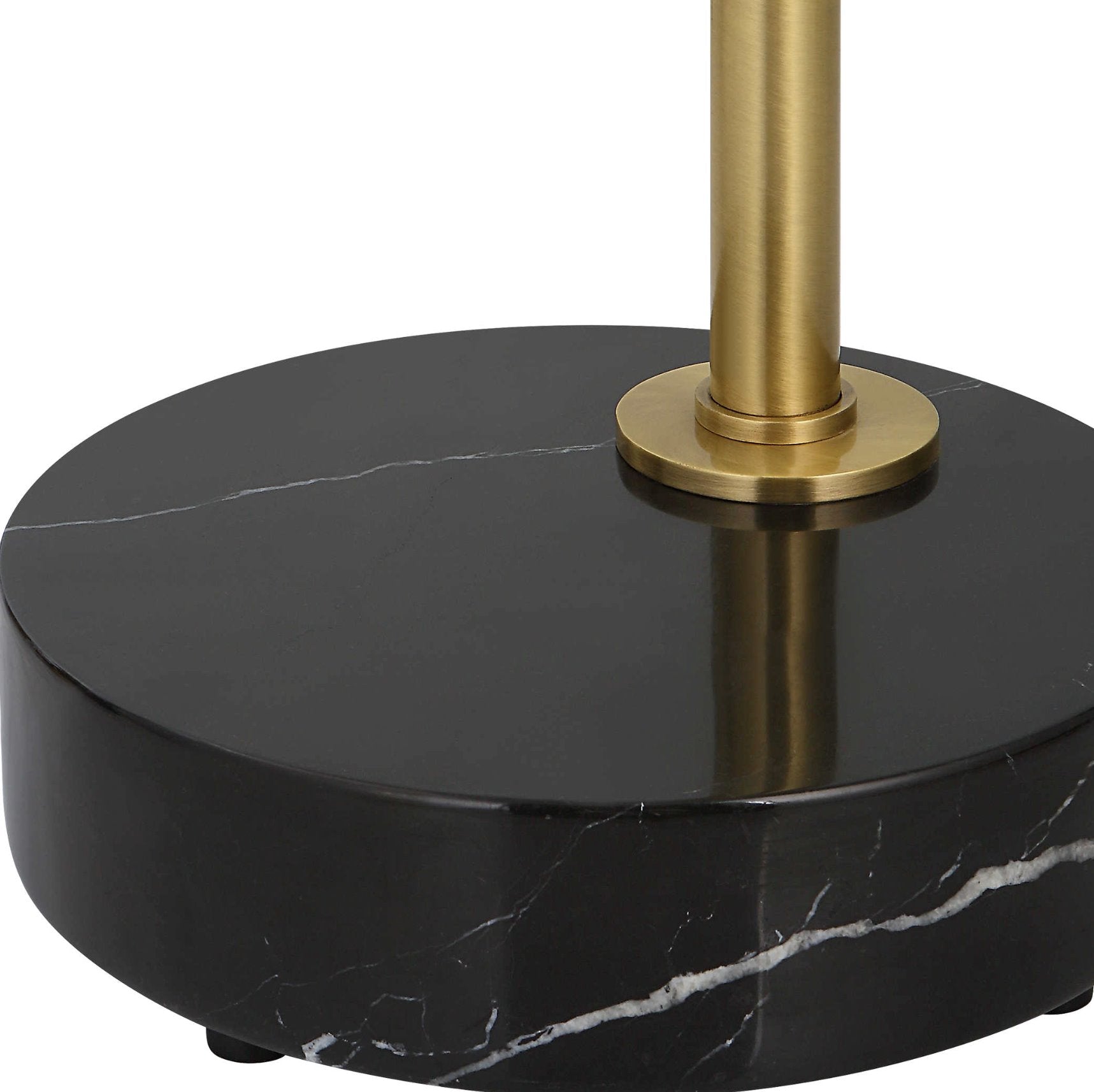 Constructed from iron with a luxurious plated antique brushed brass finish, the Huxford floor lamp features a traditional arc design and a pivoting neck, providing the option to adjust the angle of the shade. It is elegantly paired with a sleek black marble base, showcasing natural veining, and a round hardback white linen shade for a timeless look.