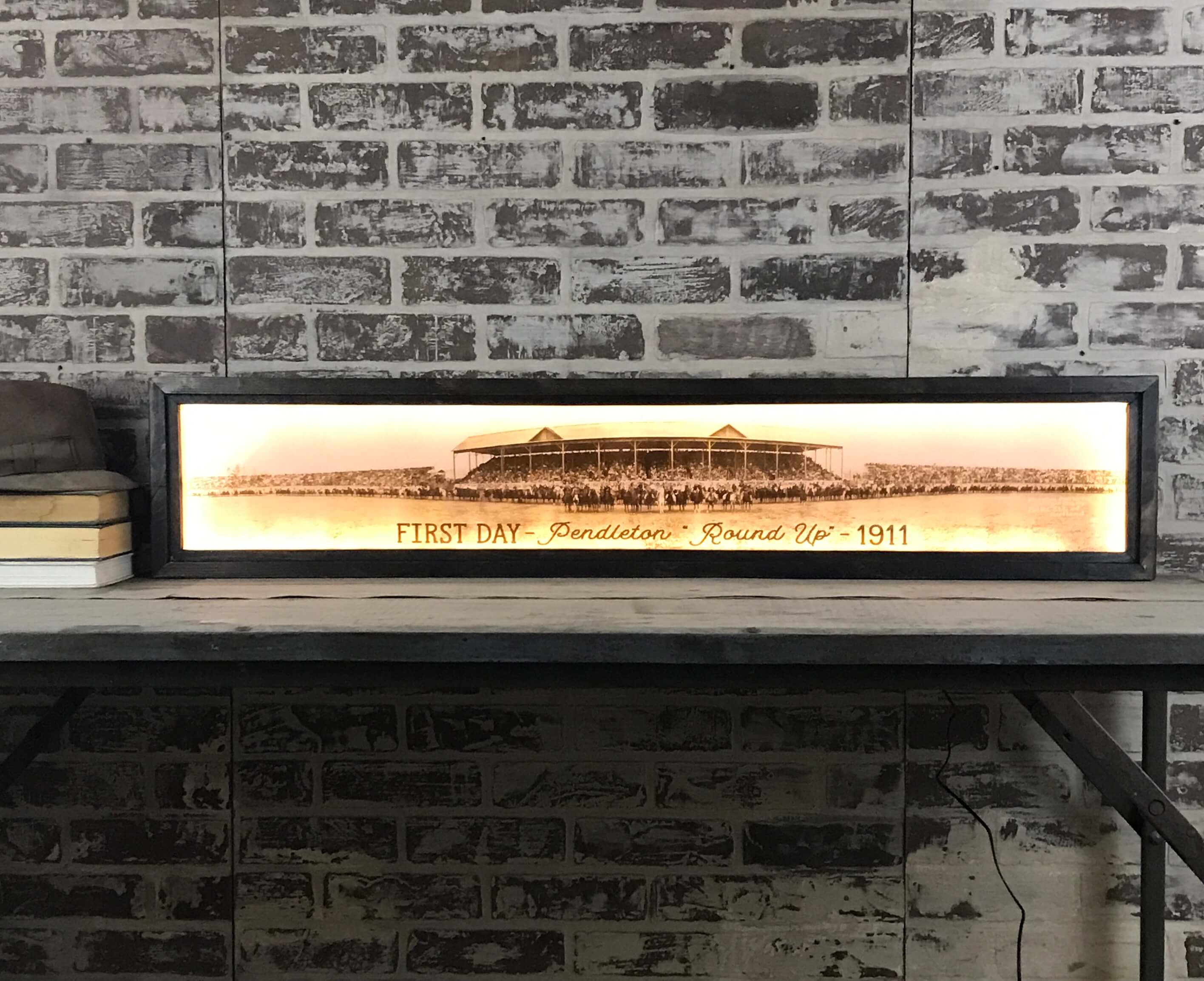 This historic print is a reproduction of the "first day" in Pendleton, Oregon's annual rodeo event, which began on September 14th, 1911.