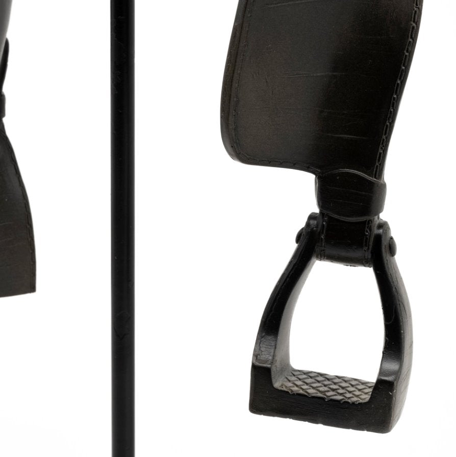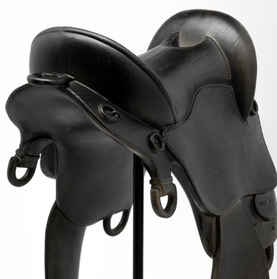 Constructed from a combination of resin and metal in a striking black finish, the Colt is the perfect addition to any farmhouse or modern design. Its form resembles an equestrian saddle, making it an impressive decorative object.