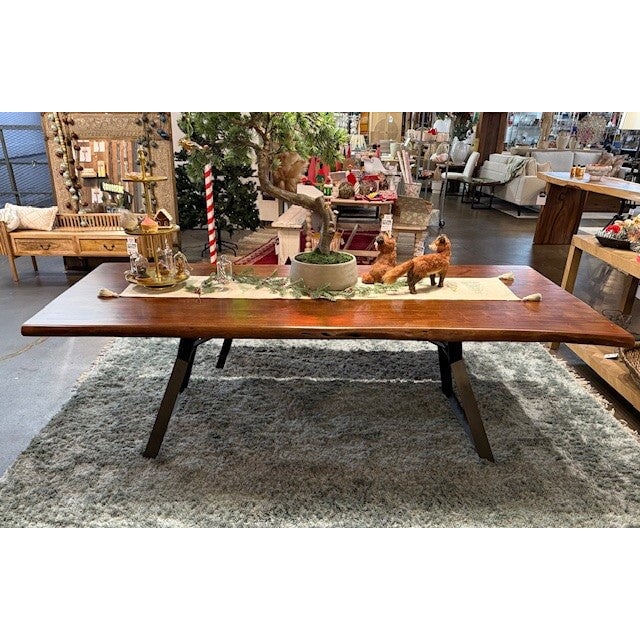 The perfect balance of industrial and rustic styles intersect to create the hand-crafted London Loft dining table. A breathtaking solid Acacia wood live edge slab floats atop modern hand forged steel base. The London Loft Collection is one of our best-selling collections. Please note that this listing is for a London Loft table at our Outlet and is sold in as-is condition.