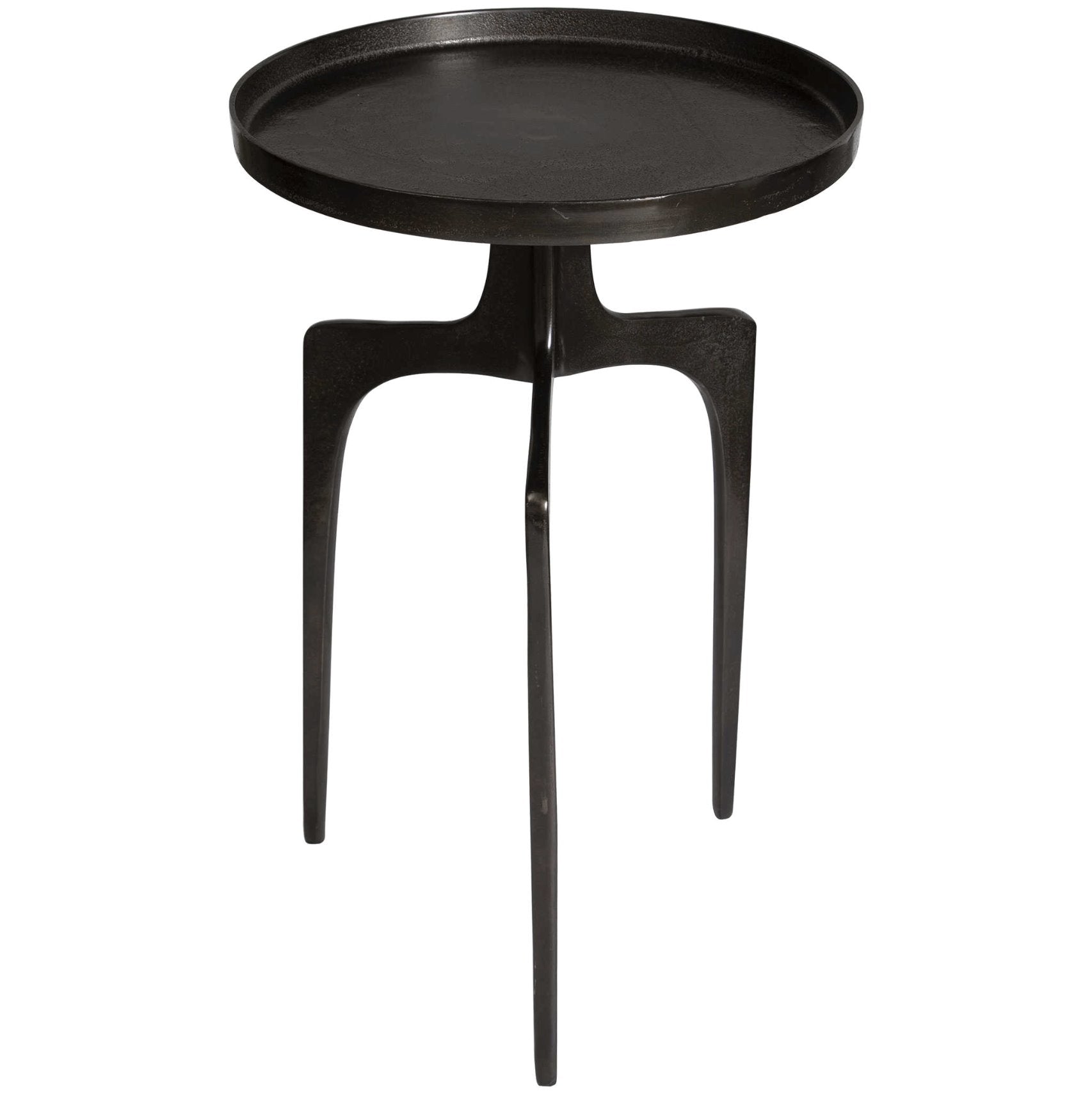 This elegant accent table is crafted of durable cast aluminum with a uniquely curved base and round top. Choose from a rich textured soft gold or a classic plated antique bronze finish.
