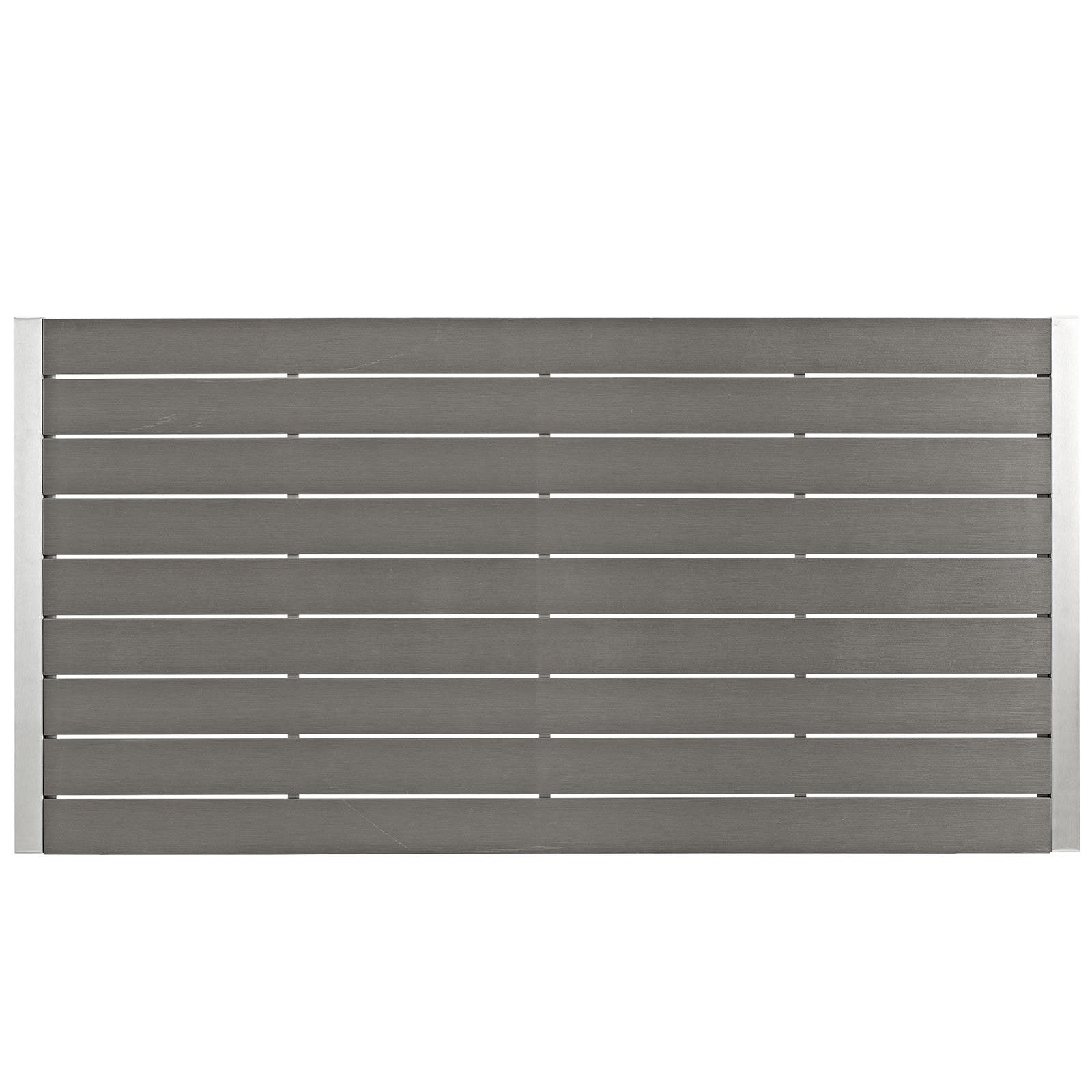 Enjoy your patio or backyard leisure time with the strong and durable Shore Outdoor Patio Dining Furniture Set. Made with an anodized brushed aluminum frame and non-marking black plastic foot caps, Shore Outdoor Dining set features tone-on-tone grays with wood accents on the paneling for a chic and minimalist look.