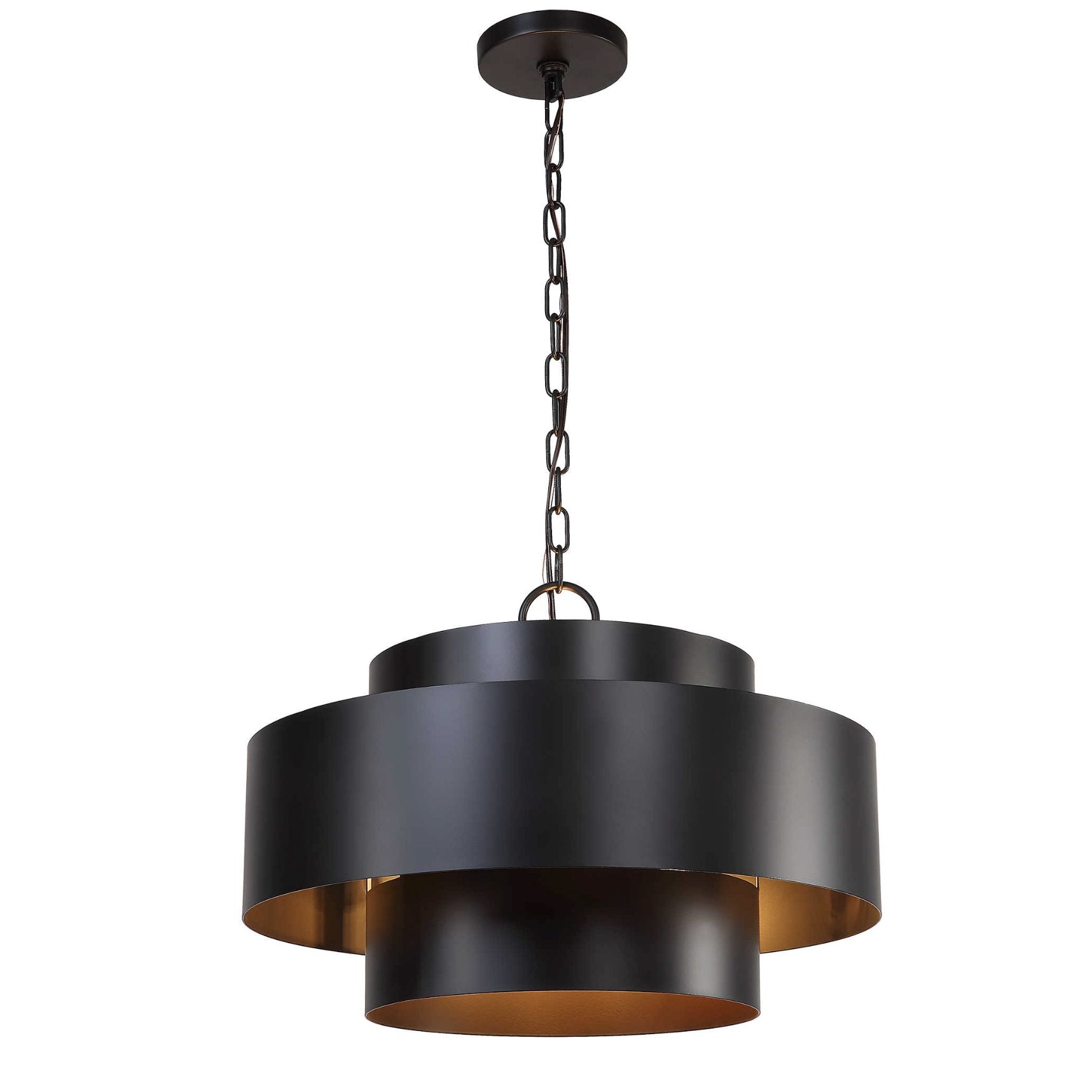 Experience the sleek and timeless design of the Youngstown Pendant with its inter-stacked cylinders in a dark bronze finish. This modern lighting fixture embodies a classic look that will elevate any space. Featuring 4 lights, 4-60 watt max candelabra sockets, supplied with 15' wire and 7' chain for adjustable installation. Bulbs not included.